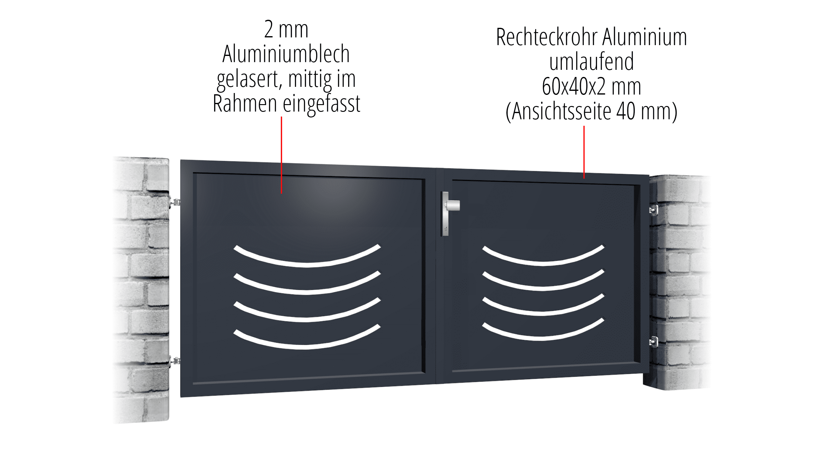 - Charnières/charnières de portail : Charnière 2D (réglable env. 30 mm par côté) ou ruban 3D (réglable env. 50 mm par côté) - varie en fonction de la situation de montage