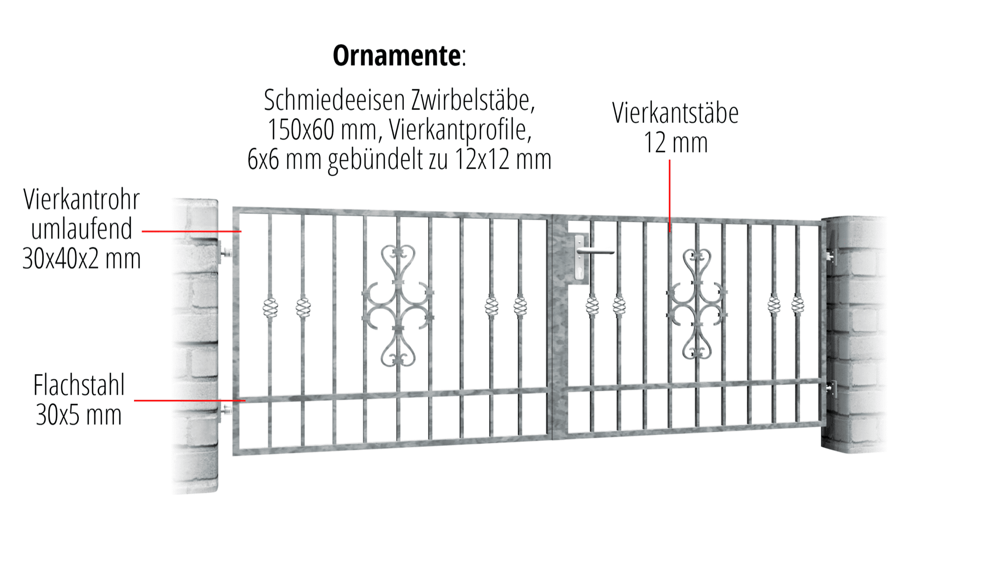 - Le nombre de barres, d’ornements ainsi que l’espacement des barres est déterminé par la taille individuelle du portillon de jardin. L'espacement maximal des barres est de 120 mm.